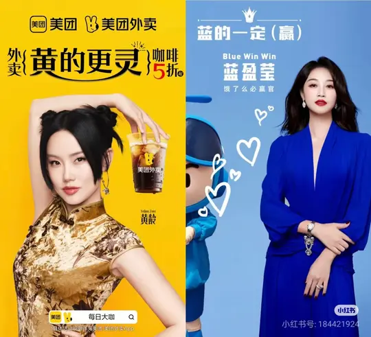 另外,两个平台的广告文案都带有颜色相关的双关语。美团用“黄”对应自身品牌色,饿了么用“蓝”对应其品牌色,同时结合艺人名字和英文口号,可能是在制造一种轻松诙谐的对比,让观众觉得有趣。