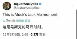 图片中的推文提到了“Musk's Jack Ma moment”,并将其翻译为“马斯克的马云时刻”。这句话是在将特斯拉CEO埃隆·马斯克(Elon Musk)与阿里巴巴创始人马云进行比较。