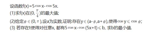 第三个问题,若存在t使得对任意x,都有5cosx - cos(5x + t) ≤ b,求b的最小值。这里可能需要找到这样的t,使得这个表达式的最大值最小化,然后求出这个最小的最大值作为b的最小值。可能需要用到三角恒等式或者优化方法,比如将表达式转换为单一的余弦函数或者其他形式,然后找到其最大值。
