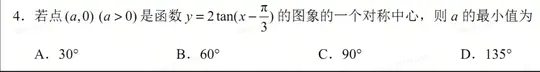 嗯,我现在要解决这个关于对称中心的问题。题目是说,点(a,0)(a>0)是函数y=2tan(x - π/3)的图像的一个对称中心,求a的最小值,选项是四个角度:30°, 60°, 90°, 135°。首先,我需要理解什么是函数图像的对称中心。对称中心通常指的是点对称,也就是关于某个点对称,即对于这个点来说,函数图像上任意一点都存在另一个点,使得这个点是两点的中点。