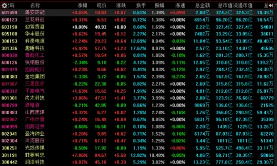 代码 名称 涨幅 现价 涨跌 换手 振幅 涨速 总金额 总市值 流通市值 总...