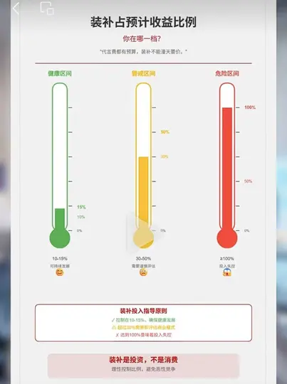 这个评估工具通过颜色编码(绿色代表健康,黄色代表警戒,红色代表危险)来直观地显示不同比例范围的状态,帮助用户快速了解其装补投入的健康状况,并提供相应的指导原则。