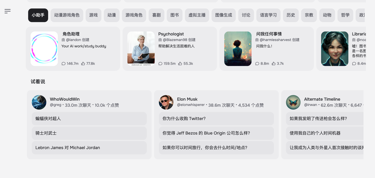 Character.AI 是个性化角色AI对话机器人平台,能够设计和互动个性化的对话角色。这些角色不仅支持多种语言,还能根据用户设定的个性、背景和知识库进行交流,展现出高度的语境理解和语言生成能力。