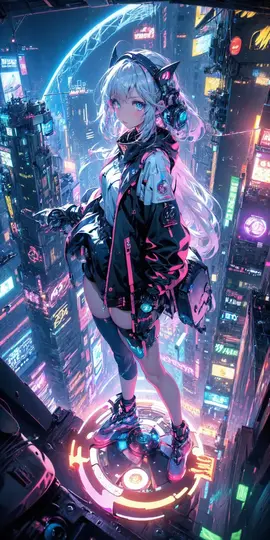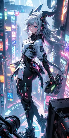> **核心关键词**:霓虹光、银灰机甲、俯视都市峡谷、冷暖极端对比、精细日漫线条