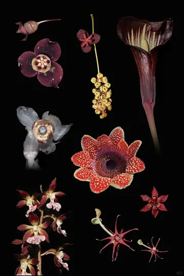 - The first flower has a deep reddish color with a tiny bud on top. Its star - shaped center and five - pointed structure make it look like it could be from the Stapelia genus, known for their star - like, often hairy flowers.