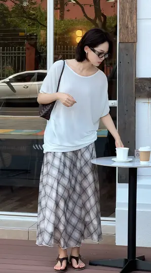 结合图片元素:白色宽松上衣、格纹长裙、露天场景(咖啡馆外)、松弛姿态,整体传递“都市里的闲适自在”。