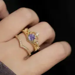1. 主戒(无名指):金色基底,戒托有镂空雕花设计,中心镶嵌一颗紫色主石(推测为紫水晶或仿紫晶),戒托两侧及顶端有小型透明锆石/钻石点缀,整体风格华丽精致,有“皇冠”造型感。