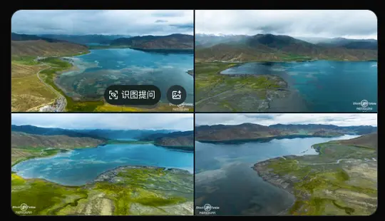 那可能的湖泊候选地,国内高原湖的话,羊卓雍措(羊湖)很典型。它的形状是蜿蜒曲折的,从不同角度看形态会有变化,而且周围山体植被和图中色调也匹配。另外西藏的佩枯措也有类似开阔水域和远山的感觉,不过佩枯措更偏向咸水湖,视觉上和羊湖的蓝绿色调有区分。再想想纳木错,但纳木错周围山更荒凉,植被没这么多,所以排除。所以更倾向羊卓雍措,因为它的多角度形态变化和图中四宫格对应得上,每个小图像是从不同方位航拍羊湖的效果。
