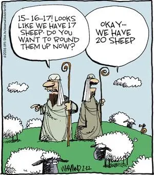 总结:这个笑话通过牧羊人之间的对话,利用了“round up”一词的双关性——既指聚拢羊群,也指数字的四舍五入——从而产生幽默效果。