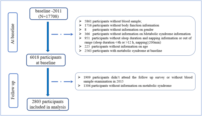 这篇研究文章探讨了睡眠时长和午睡与代谢综合征(MetS)风险之间的关联。研究基于中国健康与养老追踪调查(CHARLS)2011年和2015年的数据,对2803名45岁及以上的中国成年人进行了纵向分析。研究排除了基线时已患有MetS或数据不完整的参与者。在4年的随访期内,616名参与者(22.0%)新发代谢综合征。研究发现,与不午睡相比,长时间午睡(>30分钟/天)与代谢综合征的发生显著相关(OR: 1.247, 95% CI: 1.001, 1.554),即使在调整各种协变量后,这种关联仍然存在。在亚组分析中,长时间午睡与老年女性代谢综合征风险增加显著相关(OR: 1.946, 95% CI: 1.226, 3.090)。然而,夜间睡眠时长与代谢综合征之间没有发现显著关联。研究结论是,在中国老年人群中,较长的午睡时间与代谢综合征风险增加相关,且这种关联因性别而异。