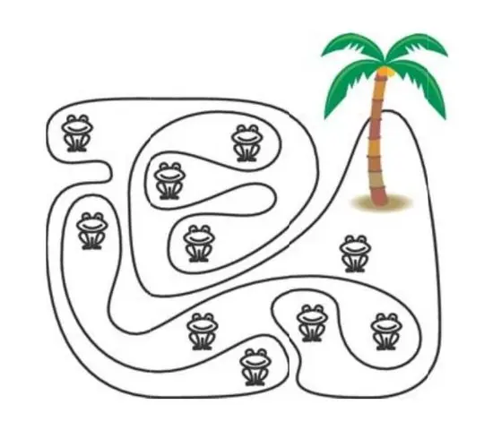 举个例子,如果一个环形线包围的区域是陆地,那么青蛙在环内就是岛上的;如果环形线包围的区域是水,则青蛙在环内可能属于在水里。这时候需要看图中是否有其他线索,比如是否有椰子树或其他陆地标志。例如,图中右上角有一棵椰子树,可能表明那里是主岛的陆地部分,周围的线条可能是海岸线。
