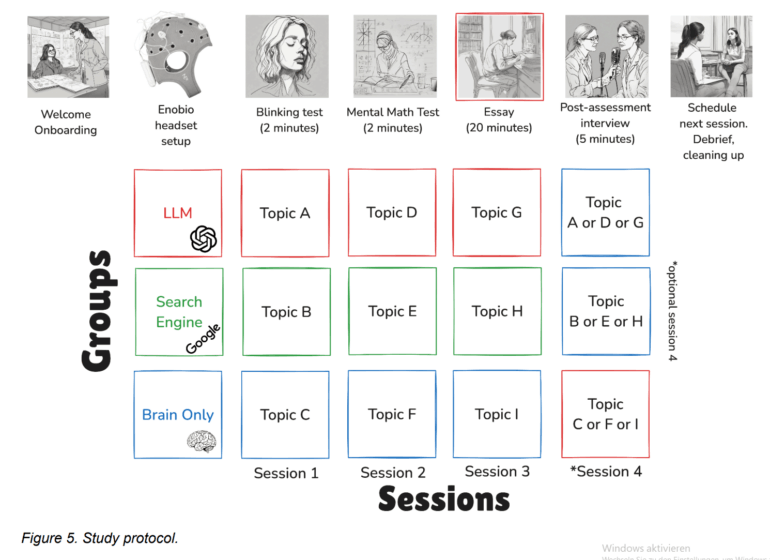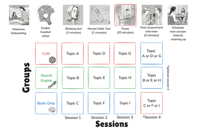 研究明确区分了三组参与者:使用AI(GPT-4o)的LLM组、使用传统搜索引擎的搜索组和纯靠大脑的组别,为比较提供了直接基础。