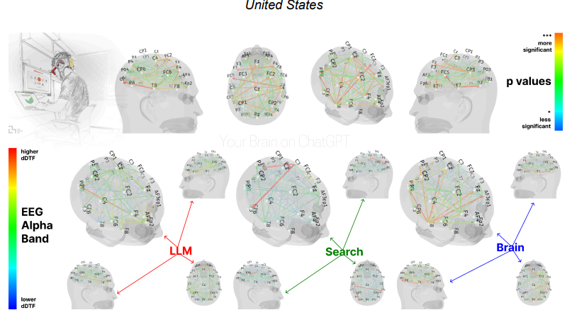 研究发现,纯大脑组展示了最强、分布最广的神经网络连接;搜索引擎用户表现出中等程度的参与;而LLM用户显示出最弱的连接性。认知活动随外部工具使用而减弱。在第四次实验中,从LLM转到纯大脑的参与者表现出alpha和beta连接性降低,表明参与度不足。文章所有权的自我报告在LLM组最低,纯大脑组最高。LLM用户在准确引用自己的作品方面也存在困难。研究结果表明,虽然LLM提供了即时便利,但可能带来认知成本,引发对LLM依赖的长期教育影响的担忧。