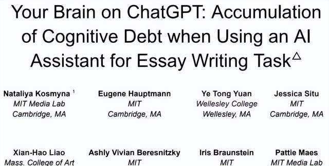 Content: 可能展示了MIT研究《Your Brain on ChatGPT: Accumulation of Cognitive Debt when Using an AI Assistant for Essay Writing Task》的封面或相关图示