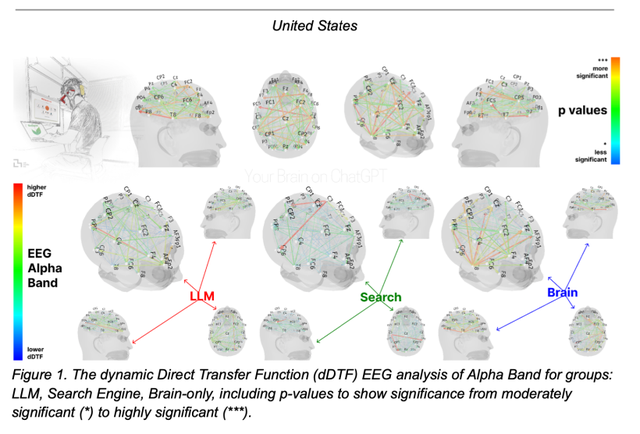 内容:展示Alpha波段下不同组别(LLM组、搜索引擎组、纯靠大脑组)的脑电活动分析结果,包括统计显著性标记