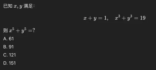 “已知 x,y 满足:x + y =1, x^3 + y^3 =19 则 x^5 + y^5 =? A.61 B.91 C.121 D.151”