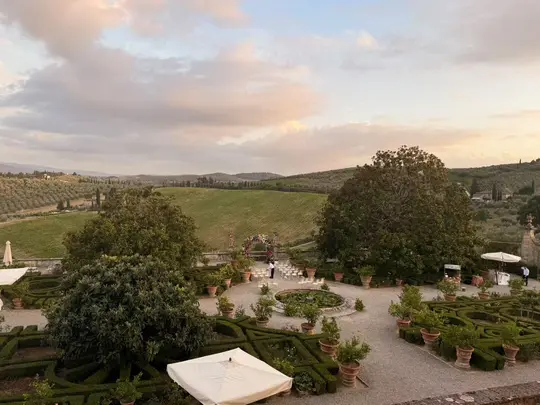 背景中连绵的橄榄园、葡萄田与柏树林是托斯卡纳(尤其是佛罗伦萨周边)的典型乡村风貌;花园里对称修剪的绿篱(topiary)、陶罐式盆栽、中心喷泉与仪式感布置(花拱门+排椅),完美契合文艺复兴时期意大利贵族庄园“将自然驯化为艺术”的造园逻辑——美第奇家族作为文艺复兴核心赞助者,其乡间别墅正是这种风格的“活态范本”。
