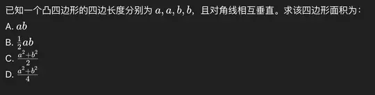 已知凸四边形的四边长度分别为 ,且两条对角线互相垂直。需要求该四边形的面积,选项为: