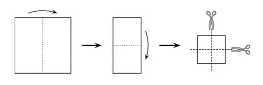 The sequence shows: start with square, fold vertical, then fold horizontal, then cut at center lines.