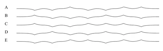 图案显示了五个水平线,标记为A到E,每个都有不同的波浪形,表示折痕的方向。