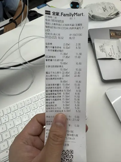 虽然我尝试手动累加小票上的所有商品金额进行验证,但计算结果为217.10元(详细计算过程见下文),与小票显示的213.02元存在差异(相差4.08元)。这可能源于小票上的项目输入错误、重复扫描或其他系统处理问题。不过,在零售收据中,官方标注的“商品小计”通常被视为最终总价,因此应以小票显示为准。