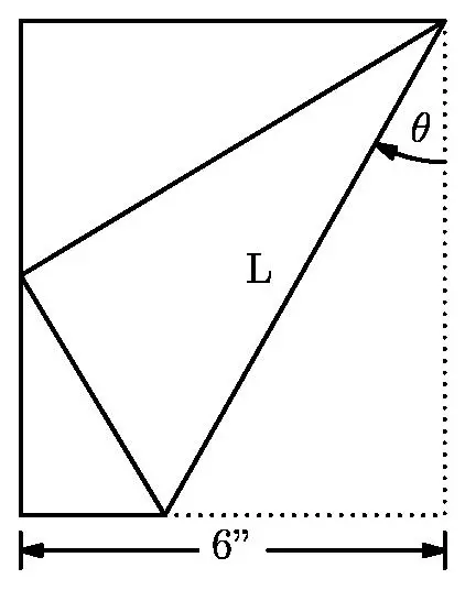 In the image, there's a rectangle, width 6 inches, and a crease L, and an angle θ at the top side. It seems that θ is the angle between the crease and the top side or something.