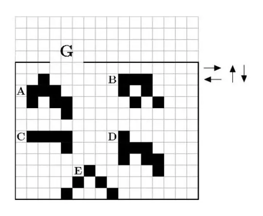 The grid consists of five figures (A, B, C, D, E) that can move left, right, up, or down in the directions indicated by the black arrows, which allow all four directions of movement. The gate G is located at the top row, and a figure can leave through G by having one of its cells occupy the G cell and then moving upward to exit.