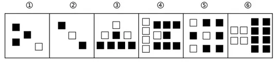 Grouping by white squares: ① and ② have 1 white; ③,⑤,⑥ have 2 white; ④ has 4 white. Not useful.