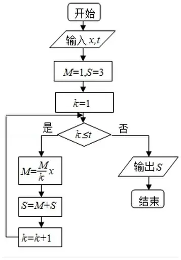 首先,我需要理解这个程序框图的功能。程序从开始输入 x 和 t 开始,初始值 M=1,S=3,k=1。然后进入一个循环,判断 k≤t 是否成立。如果成立,执行循环体:M=kM×x,S=M+S,k=k+1。如果不成立,输出 S。
