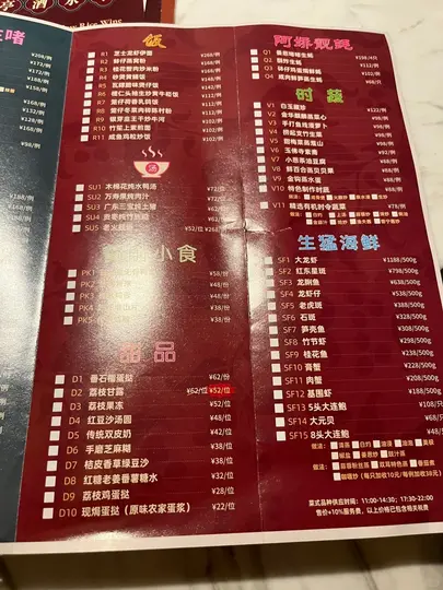看菜单内容,菜单分为几个部分:包括“啫”(可能是粤菜中的一种烹饪方式)、“饭”、“阿娇靓蚝”(可能和生蚝有关)、“时蔬”、“汤”、“餐前小食”、“甜品”、“生猛海鲜”等。