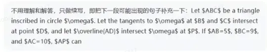 不用理解和解答,只做续写,即把下一段可能出现的句子补充一下: Let ABC be a triangle inscribed in circle ω. Let the tangents to ω at B and C intersect at point D, and let AD intersect ω at P. If AB=5, BC=9, and AC=10, AP can