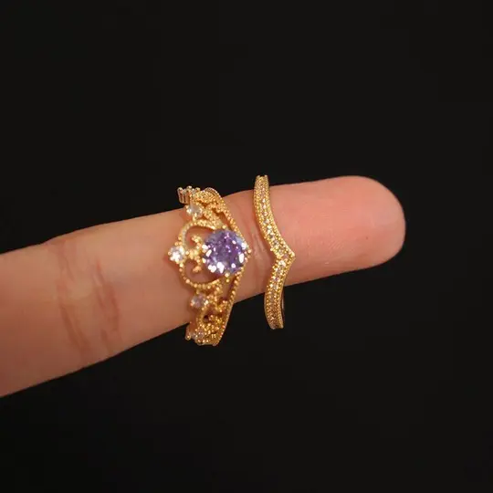 首先得拆解产品卖点:从图片看是皇冠造型金戒+排钻V型戒的组合,紫色主石很吸睛,工艺有镂空花纹、镶钻细节。结合沙特消费偏好,当地婚恋文化中珠宝象征承诺,宗教文化里金色有特殊意义,所以文案要融文化共鸣点。