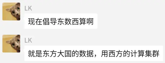 嗯,用户发来的这个聊天记录截图里,LK提到了“东数西算”,然后解释说“东方大国的数据用西方的计算集群”。用户想要我讲解这个笑话。首先,我需要确认“东数西算”是什么。