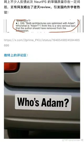 嗯,用户让我解释这张X上的梗图,涉及NeurIPS的审稿问题。首先,我需要理解这张图片的内容。图片中有两个部分,上面是一条关于NeurIPS审稿质量的讨论,中间有一个审稿意见的截图,指出“Adam”可能是个拼写错误,建议作者删除。然后下面有一张汽车后保险杠贴纸,上面写着“Who's Adam?”。