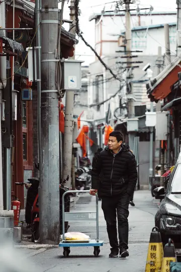 把手推车上的图片替换成一个西瓜, 左侧电线杆写上手写体的"上海你好"。 把图片中人物的鞋子换成白色的