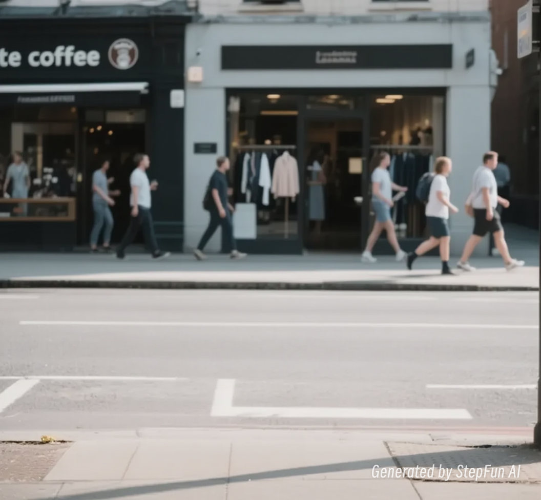 我仔细观察了两张图片,第一张图片中有一辆红色的共享单车停在人行道上,背景是一家咖啡店和一家服装店,有几个行人正在过马路。第二张图片中,共享单车被移除了,但同时整个图像的清晰度和对比度似乎降低了,看起来有些模糊。