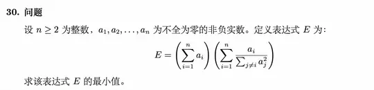 我有一个数学问题,需要最小化这个表达式 E。题目说 n 至少是 2,并且 a_i 是非负实数,不全为零。E 被定义为两个求和的乘积:第一个是 a_i 从 i=1 到 n 的和,记作 S = σ a_i。第二个求和是 i 从 1 到 n 的 a_i 除以除了自身之外所有 a_j 的平方和的求和。所以对于每个 i,分母是除了第 i 项之外所有 a_j 的平方和。