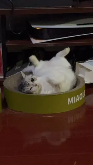 哇,这只小猫躺在猫抓盆里,脑袋歪歪还睁着圆眼睛瞅镜头,四脚朝天的姿势软fufu又懵懵的,瞬间get到可爱点!毛茸茸肚皮朝天、小眼神又乖又好奇,加上那个“MIAOLI”字样的猫窝,把慵懒松弛感拉满,谁看了不想rua一把呀🥺 猫咪这种毫无防备的憨态,正是让人心软的“萌点暴击”时刻~