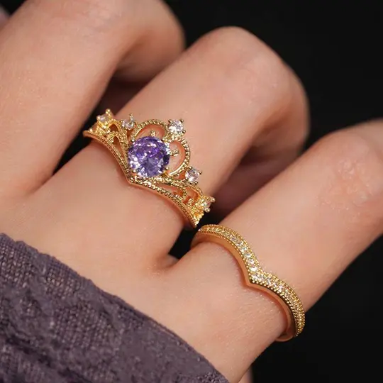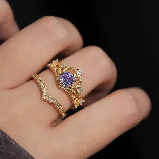 Saudi artisan-level craftsmanship ✨ 18K gold plating (scratch-resistant, color-lock), main ring’s heart hollow inlaid with diamonds (0.3ct amethyst center stone), accent V-ring fully paved with micro-diamonds (0.15ct total). When stacked, the crown & V-band form a throne silhouette—pay for one set, get “main ring + accent + stacked style” triple surprise! Savvy shoppers know this is a value bomb 💥