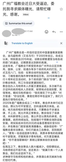 这封邮件反映的是广州广福教会近期遭遇的严重迫害情况。教会委托邮件发送者寻求媒体曝光,以引起社会关注。以下是邮件内容的详细分析: