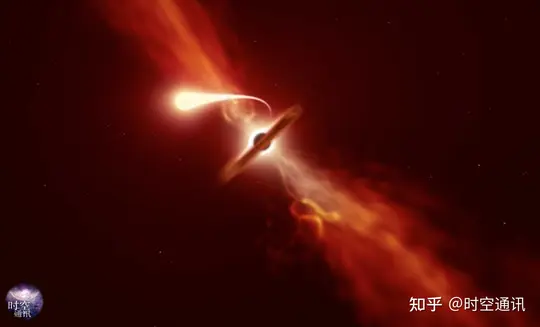 - 被吞噬的天体:左侧明亮的“泪滴状”物体,可理解为恒星等天体被黑洞引力捕获,在坠向黑洞前因潮汐力被撕碎、加热后释放的光(类似“潮汐瓦解事件”的艺术表现)。