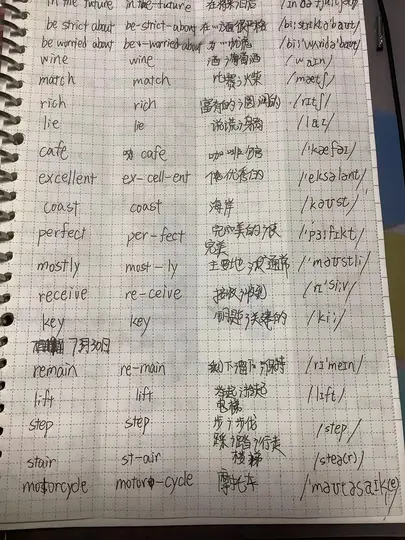 这是一份英语学习笔记,主要用于记录和复习单词的拼写、发音和词义。笔记内容条理清晰,格式规范,重点突出,适合用于日常学习和备考。学习者通过这种系统的方式,能够有效记忆单词,并掌握其正确发音和用法。