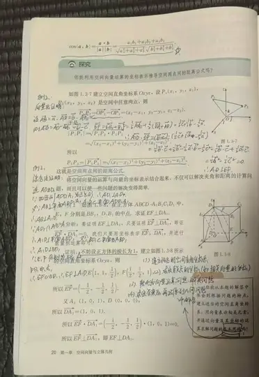 这张图片是一本数学教材的一页,内容主要涉及空间向量和立体几何的知识,特别是如何利用向量运算推导空间中两点间的距离公式,以及如何用向量方法解决立体几何问题。以下是图片内容的详细解读: