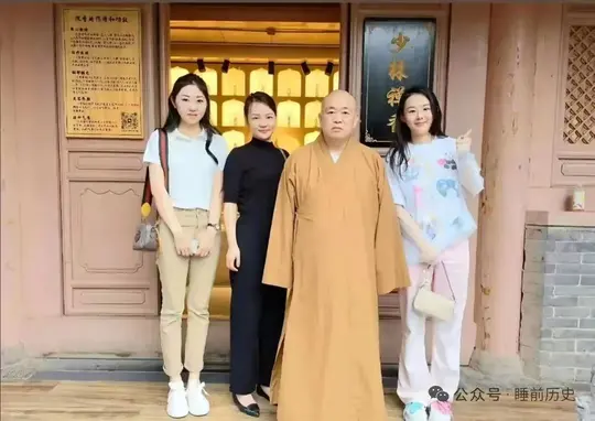 这张图片主要记录了游客在寺庙与僧人合影的场景,反映了现代旅游文化与传统宗教场所之间的互动。整体氛围轻松,但女性游客的姿势与寺庙的庄重感形成了一定的反差。图片可能意在记录一次普通的寺庙参观经历,但也引发了对旅游行为与宗教尊重之间平衡的思考。