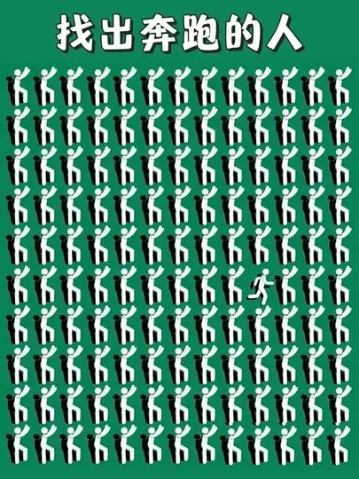 在网格中,大部分小人是抬手站立(姿势统一),只有一个是奔跑姿势(手臂摆动、腿部动作不同)。通过视觉定位: