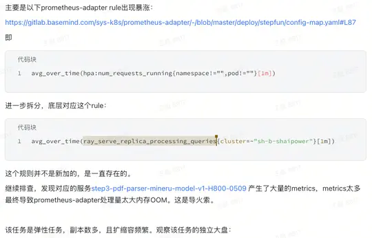 从您提供的信息来看,核心问题是 Prometheus-adapter 因处理过量 metrics 导致内存溢出(OOM),根源是服务 step3-pdf-parser-mineru-model-v1-H800-0509 生成了海量 metrics,且该任务副本多、扩缩容频繁。以下是对问题的拆解分析和解决方案建议: