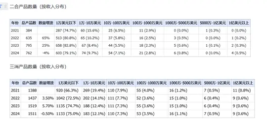 | 年份 | 总产品数 | 数量增速 | 1万美元以下 | 1万-10万美元 | 10万-100万美元 | 100万-500万美元 | 5000万-1亿美元 | 1亿美元以上 |