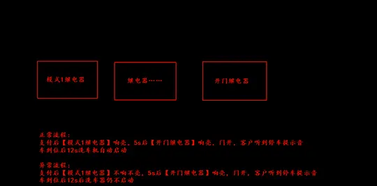 异常流程是:支付后【模式1继电器】不响不亮,5秒后【开门继电器】响亮,门开,客户听到停车提示音,但车到位后12秒洗车机仍不启动。问题在于【模式1继电器】会随机在某一次不响不亮,导致洗车机不启动。