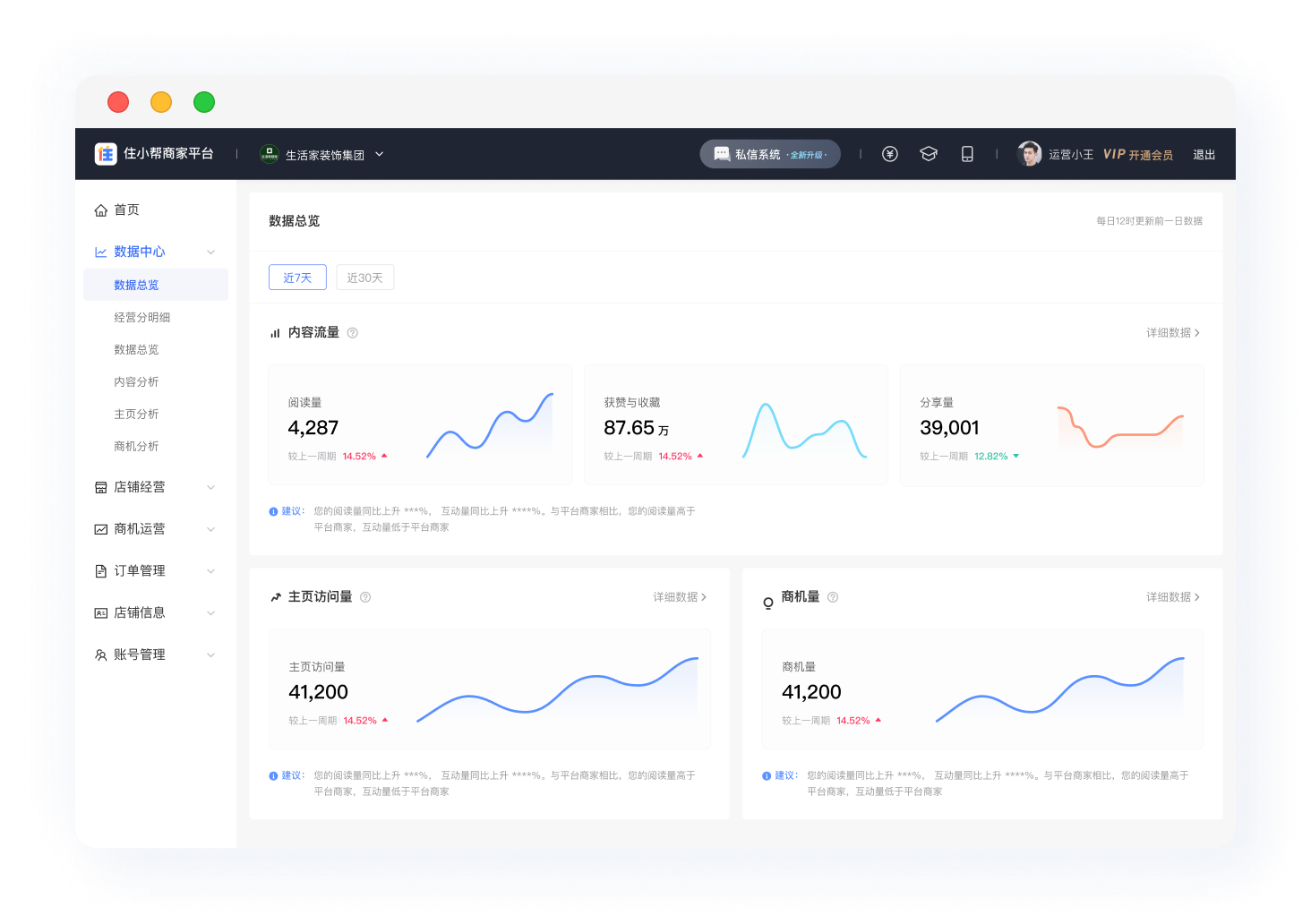 住小帮商家平台是一个一站式商家智慧经营平台,专为家装行业商家提供全方位的经营管理解决方案。平台已有超过20,000家合作商家入驻,覆盖350多个城市区域,拥有10,000多名活跃装修业主,其中83%以上用户为家装需求精准人群。平台主要功能包括经营数据看板、智能团队管理、客资管理与外呼、在线咨询与户型诊断以及私信小助手等。经营数据看板提供直观的数据展示,帮助商家诊断店铺经营状况,实现与真实业主的有效连接,平台周曝光次数达52万+,周咨询人数增长35%+,转化成本降低24%。多家入驻商家如造居美好家居研究所、赫设计、品胜装饰、设计师猫姐等均给予了积极评价,认为平台操作便利、功能齐全,能够有效展示作品并连接潜在客户,帮助商家实现业务增长。