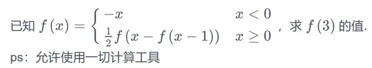 另一个想法:在定义中,对于 x>=0,f(x) = 1/2 f(x - f(x-1)),所以 f(x) 依赖于 f(x-1),而 f(x-1) 是 f 在 x-1 处的值。